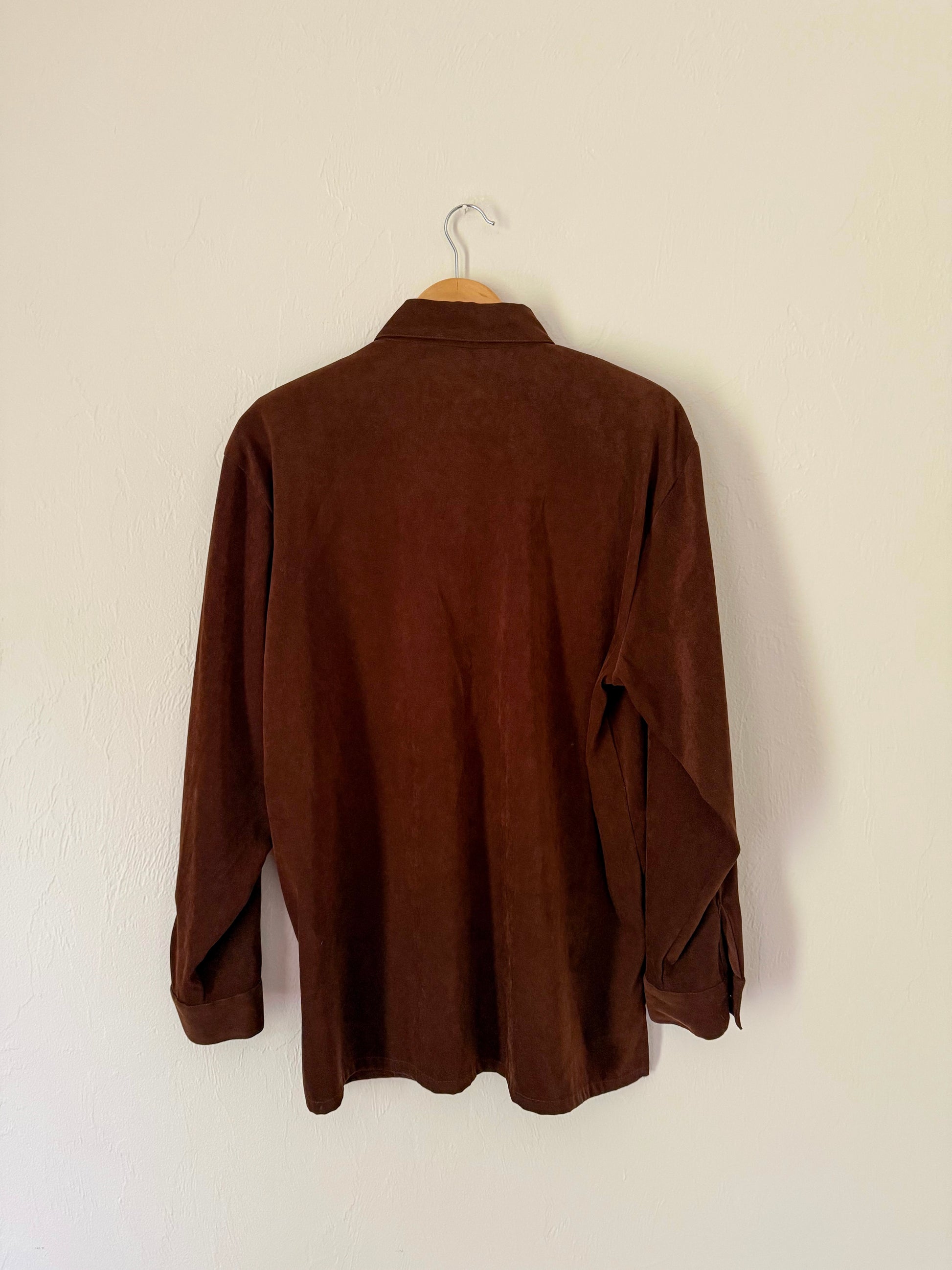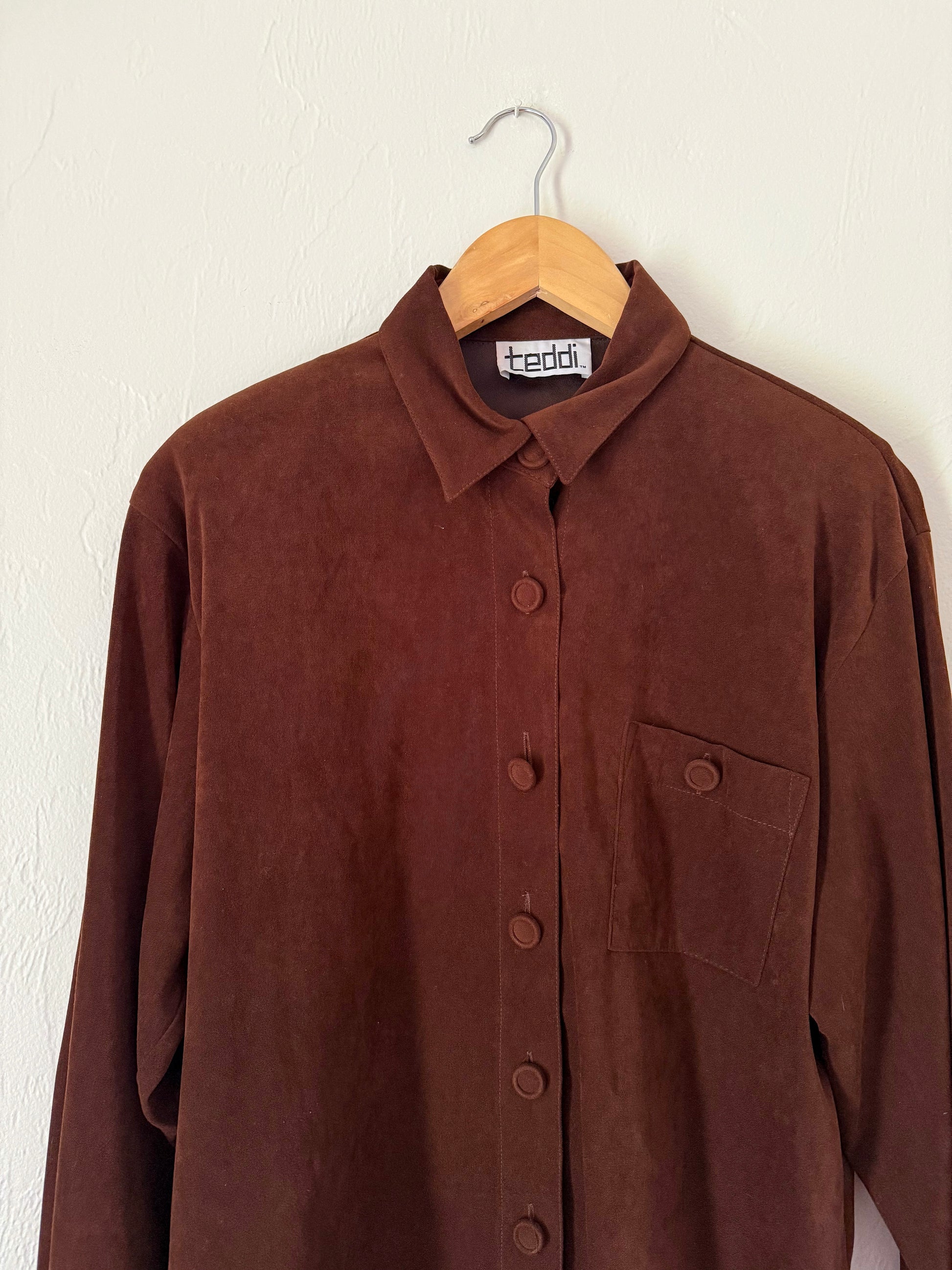 Vintage 90s brown faux suede button up. This top has shoulder pads that I personally would cut out but I wanted to leave that option for whoever purchases. No material tags, feels like a poly blend.