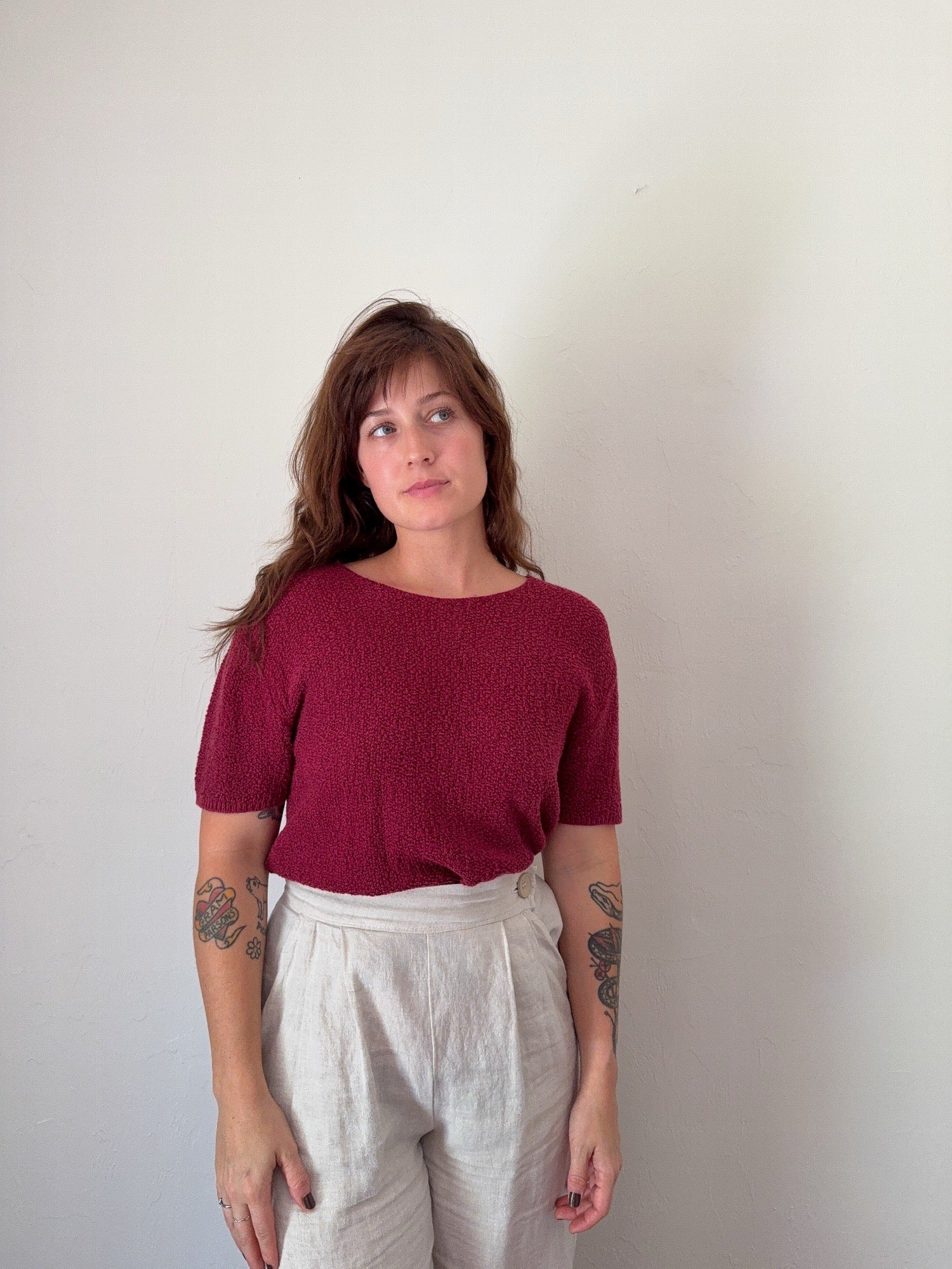 90s Byer California textured maroon top. It has two tears on the bottom trim where the seam meets the trim. Made in USA. 50% cotton 50% rayon