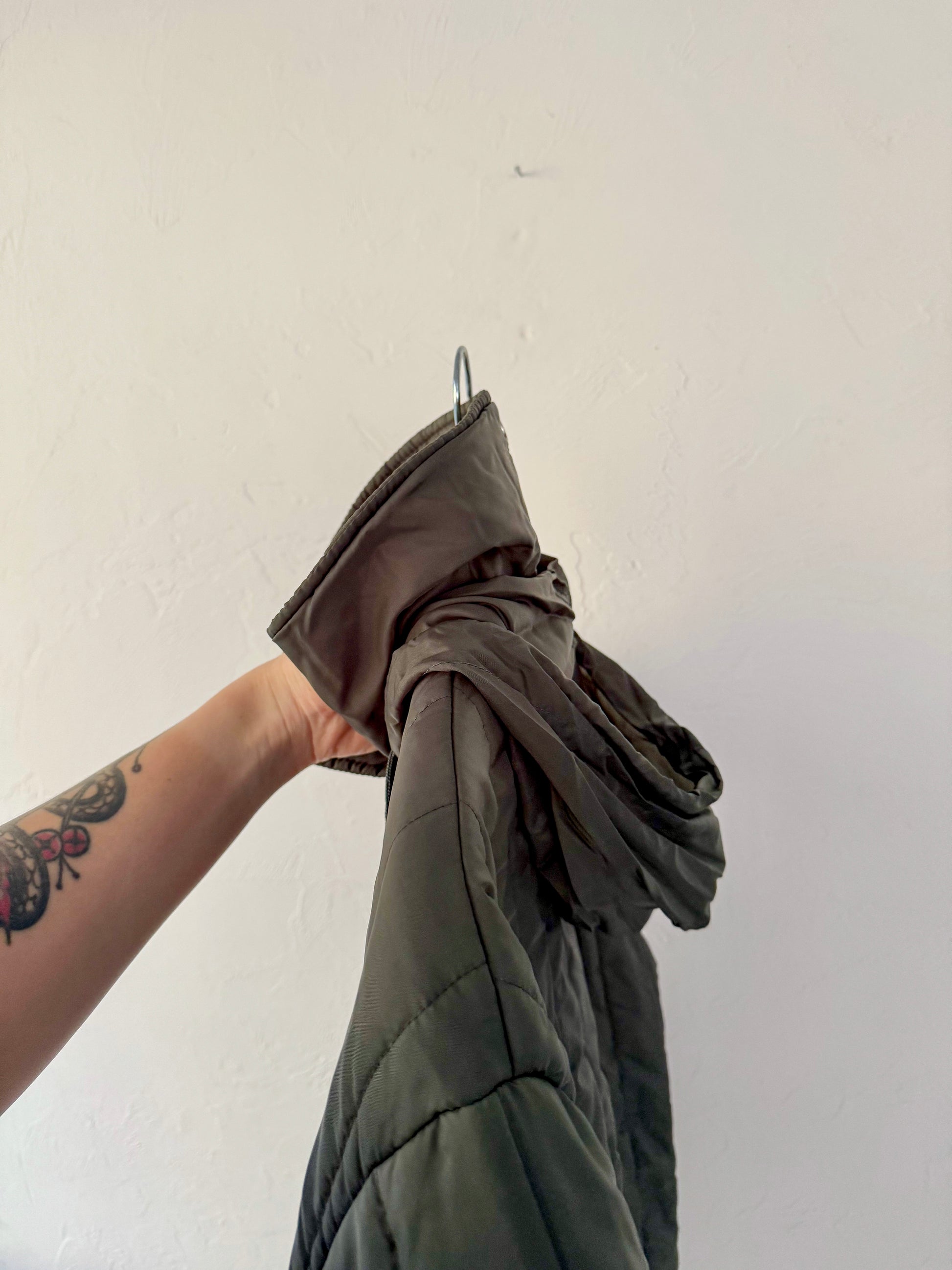 Vintage Sears Work Leisure green bomber puff jacket. This has a zipper down front, pockets and a hood that can be rolled up and buttoned underneath the collar. 100% nylon. Please note it does have a small repair I stitched up on the front.